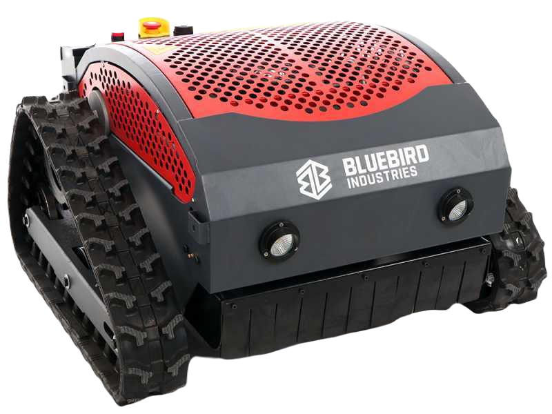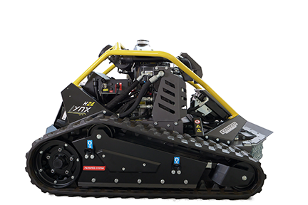 Macchina radiocomandata cingolata progettata per lo sfalcio in condizioni estreme; piatto di taglio ventrale da 100 cm per la massima compattezza e agilità.